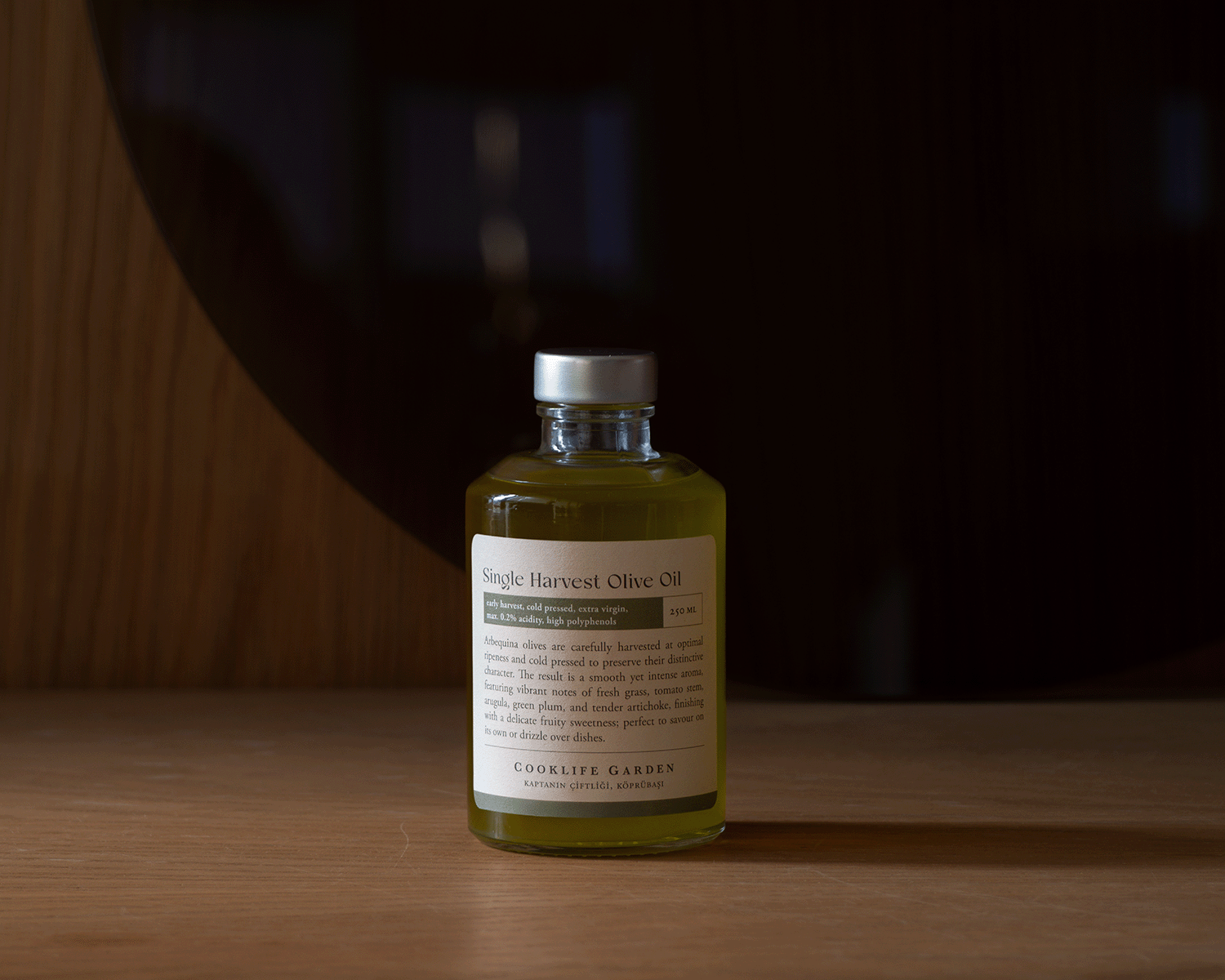 The olive oil we produce in collaboration with Kaptanın Çiftliği is made from Arbequina olives grown in Köprübaşı, Manisa. This limited production olive oil is harvested as soon as the olives begin to turn purple. Acid formation is prevented by cold pressing at 27°C within 2 hours. It is filtered on the same day using paper filters, preserving its character before bottling. As an initial flavour, it offers an intense and smooth aroma.