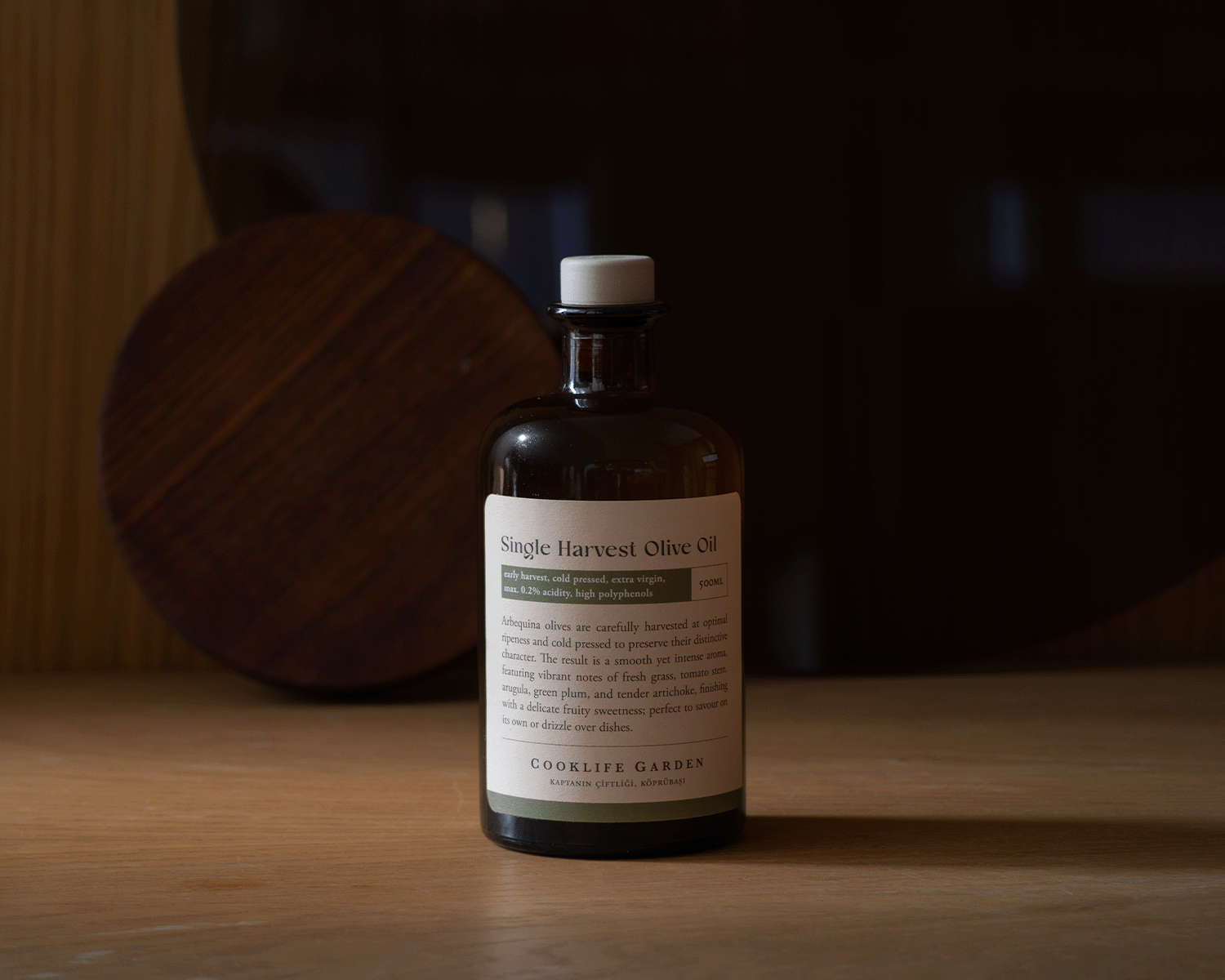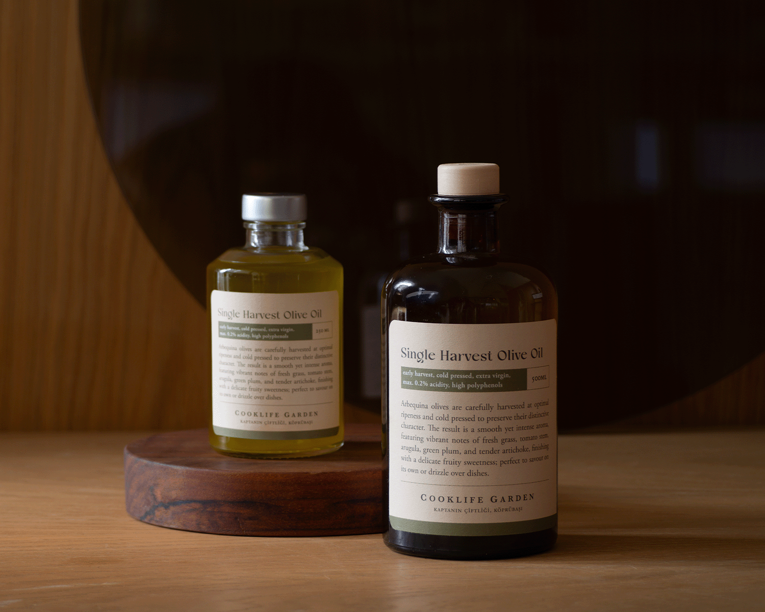 The olive oil we produce in collaboration with Kaptanın Çiftliği is made from Arbequina olives grown in Köprübaşı, Manisa. This limited production olive oil is harvested as soon as the olives begin to turn purple. Acid formation is prevented by cold pressing at 27°C within 2 hours. It is filtered on the same day using paper filters, preserving its character before bottling. As an initial flavour, it offers an intense and smooth aroma.