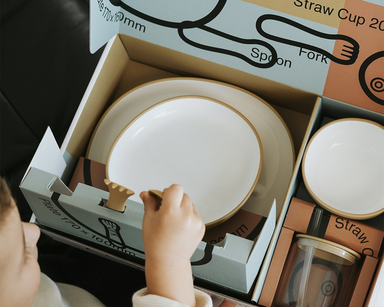 The set includes a fork and spoon, a bowl (110 × 110 mm), two plates in different sizes (240 × 220 mm and 170 × 160 mm), and a 200 ml straw cup.