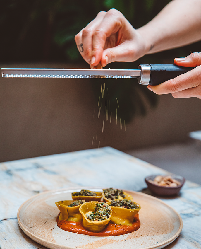 İçerisinde bulunan MESA isimli restoranda tamamen bitki merkezli (plant-based) bir menü yer alıyor. Yumurta, balık, süt ve hiçbir et ürünü kullanmadan yenilikçi bir mutfak tüm cömertliği ile zihin ve beden için benzersiz lezzetleri misafirlerine sunuyor. Tüm menüde; yiyeceklerin besinsel niteliğini koruması ve vücudu yenilemesi ön plana alınırken, içecek seçimlerinde de aynı hassasiyeti gözlemliyoruz. Burada ev yapımı sodaları keşfedebilir, isterseniz musluklardan özel refill şişenize kombucha doldurabilirsiniz.