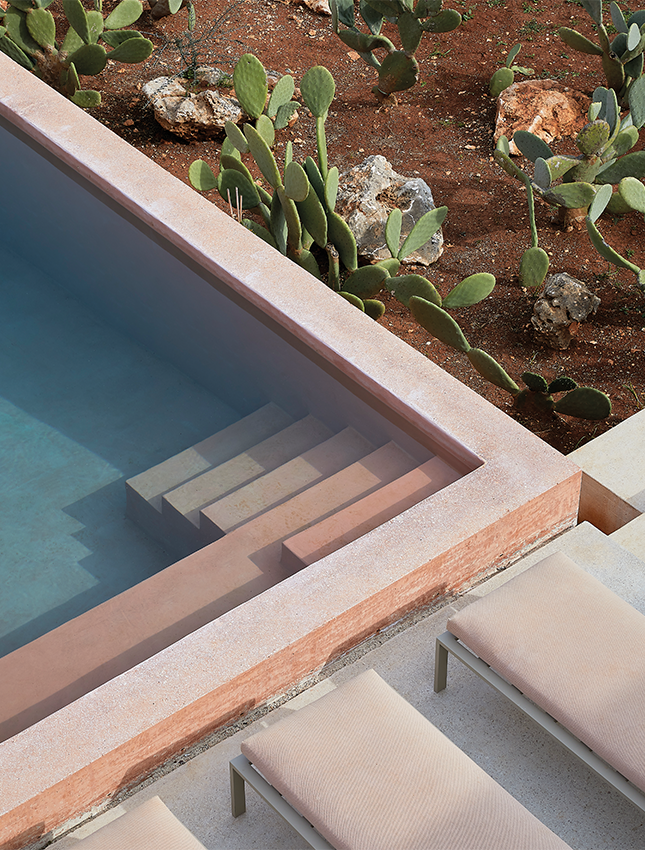 Andrew Trotter, Villa Cardo’nun her bir odasını mümkün olduğunca yalın bir yaklaşımla tasarladığını belirtiyor. Bu sayede konuklar için huzur veren bir koza yaratırken evin minimal cephesiyle uyumlu bir estetik ortaya koyuyor. Toprak tonlarının sıklıkla tercih edildiği odalarda ahşap mobilyalar ve keten kumaşlar öne çıkarken, mutfak ve banyolarda doğaya öykünen dokulara terrazzo kaplama eşlik ediyor.
