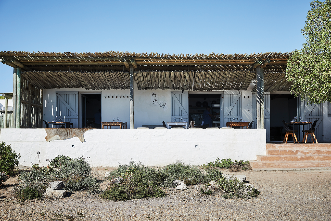 Duvarlar bölgedeki çoğu yerde olduğu gibi beyaz sıvalı, misafirleri tüm doğallığıyla karşılayan yeşil ahşap ön kapısıysa sıcacık rengi ve yıpranmış dokusuyla içerideki doğal lezzetlerin sinyallerini veriyor! Küçük ve iyi donatılmış bir mutfağa sahip olan restoranın, ahşap ve çelik karışımı mobilyaları kendiliğinden çarpıcı.